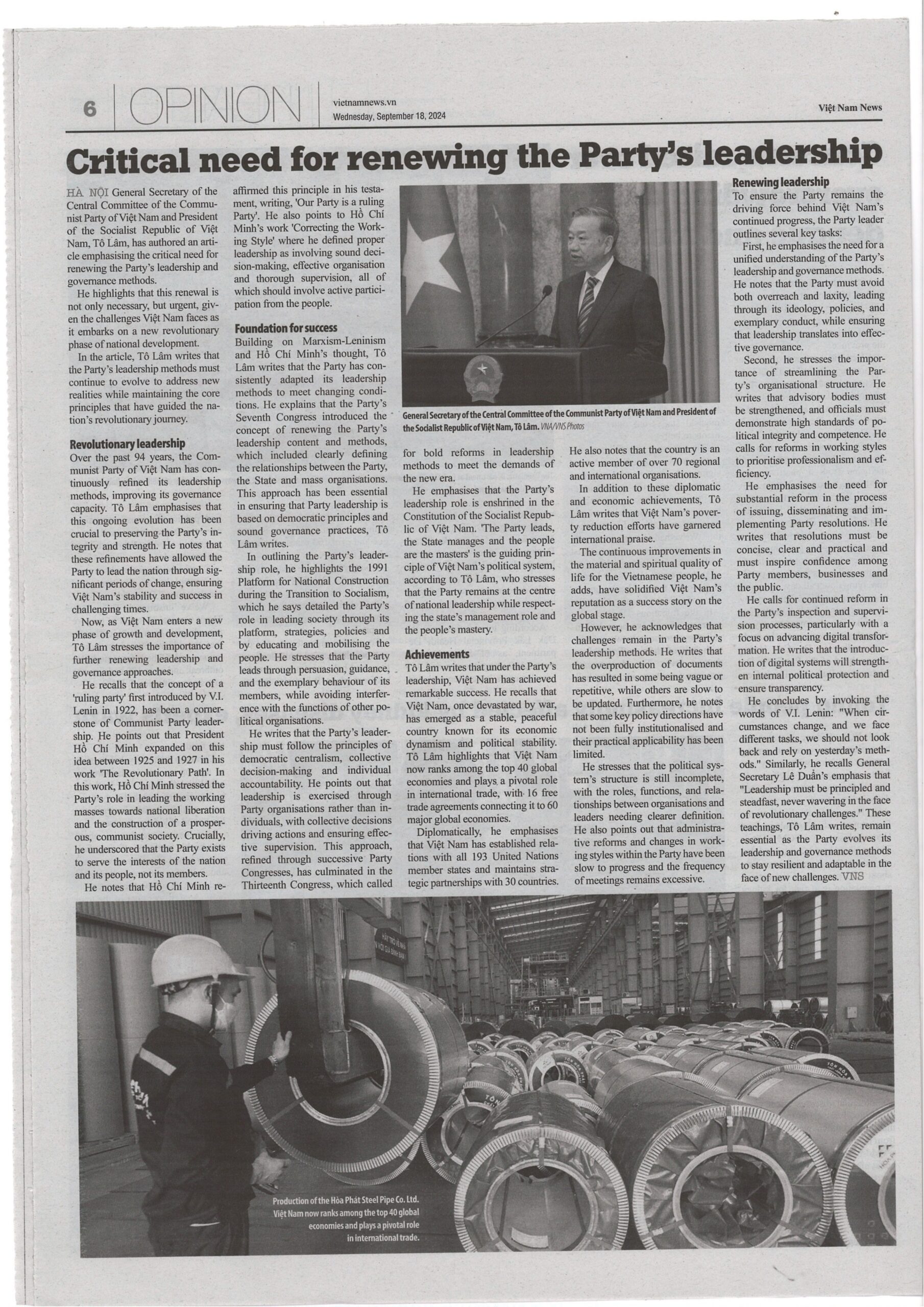 Now, as Việt Nam enters a new phase of growth and development, Tô Lâm stresses the importance of further renewing leadership and governance approaches.” – Viet Nam News
