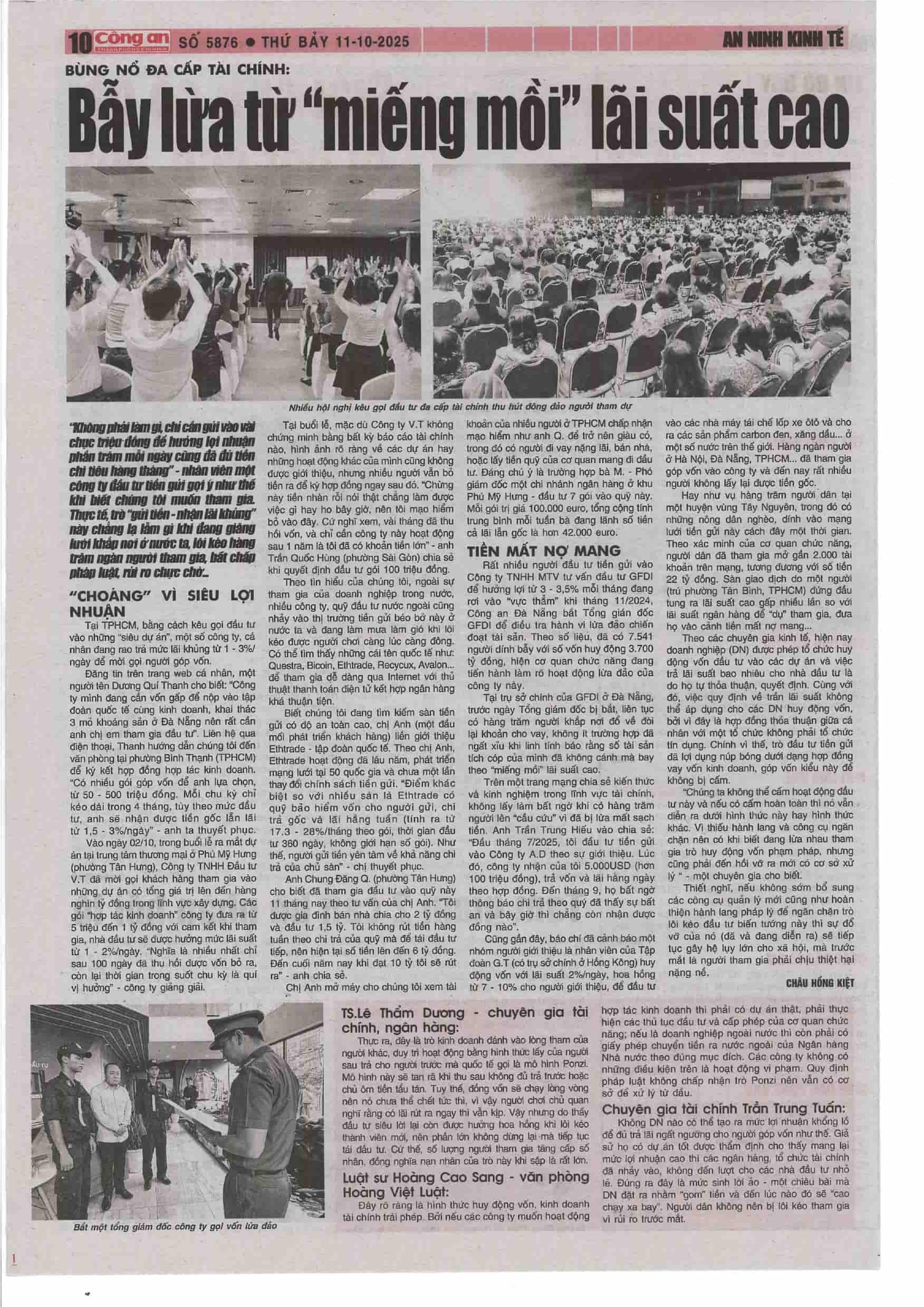 “Đăng tin trên trang web cá nhân, một người tên Dương Quí Thanh cho biết: “Công ty mình đang cần vốn gấp để nộp vào tập đoàn quốc tế cùng kinh doanh, khai thác 3 mỏ khoáng sản ở Đà Nẵng nên rất cần anh chị em tham gia đầu tư”. Liên hệ qua điện thoại, Thanh hướng dẫn chúng tôi đến văn phòng tại phường Bình Thạnh (TPHCM) để ký kết hợp đồng hợp tác kinh doanh. “Có nhiều gói góp vốn để anh lựa chọn, từ 50 – 500 triệu đồng. Mỗi chu kỳ chỉ kéo dài trong 4 tháng, tùy theo mức đầu tư, anh sẽ nhận được tiền gốc lẫn lãi từ 1,5 – 3%/ngày” – anh ta thuyết phục.” – Trích Báo CA. TP.HCM