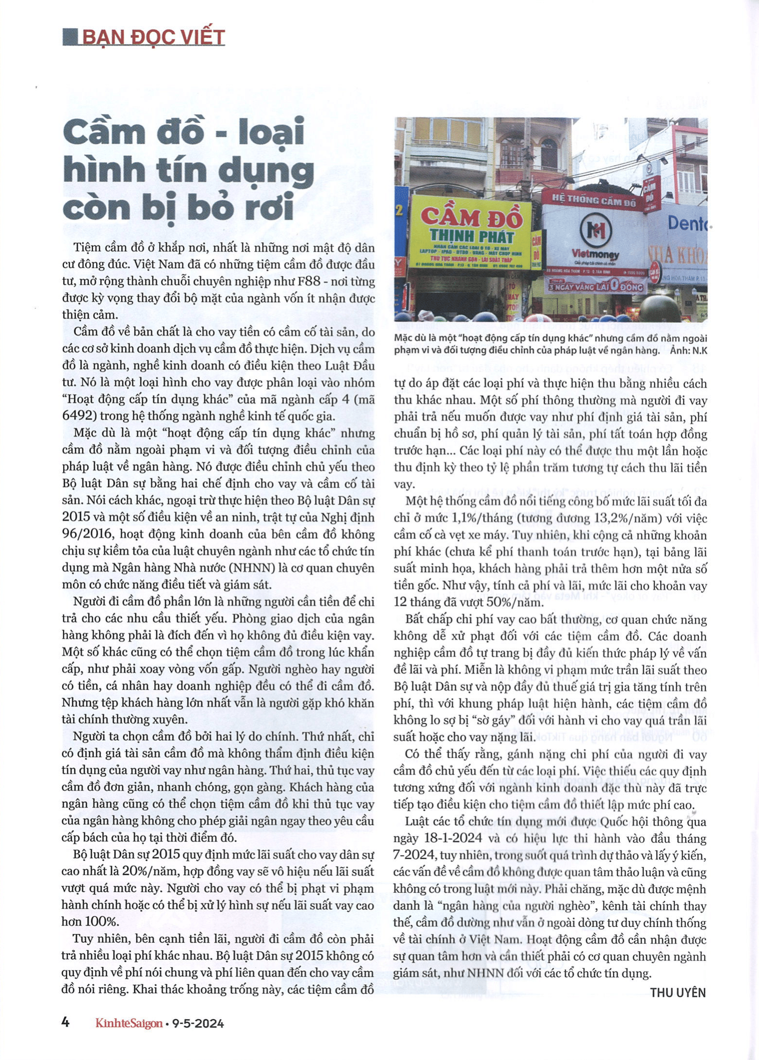 “Cầm đồ về bản chất là cho vay tiền có cầm cố tài sản, do các cơ sở kinh doanh dịch vụ cầm đồ thực hiện. Dịch vụ cầm đồ là ngành, nghề kinh doanh có điều kiện theo Luật Đầu tư. Nó là một loại hình cho vay được phân loại vào nhóm “Hoạt động cấp tín dụng khác” của mã ngành cấp 4 (mã 6492) trong hệ thống ngành nghề kinh tế quốc gia. Mặc dù là một “hoạt động cấp tín dụng khác” nhưng cầm đồ nằm ngoài phạm vi và đối tượng điều chỉnh của pháp luật về ngân hàng. Nó được điều chỉnh chủ yếu theo Bộ luật Dân sự bằng hai định chế cho vay và cầm cố tài sản”