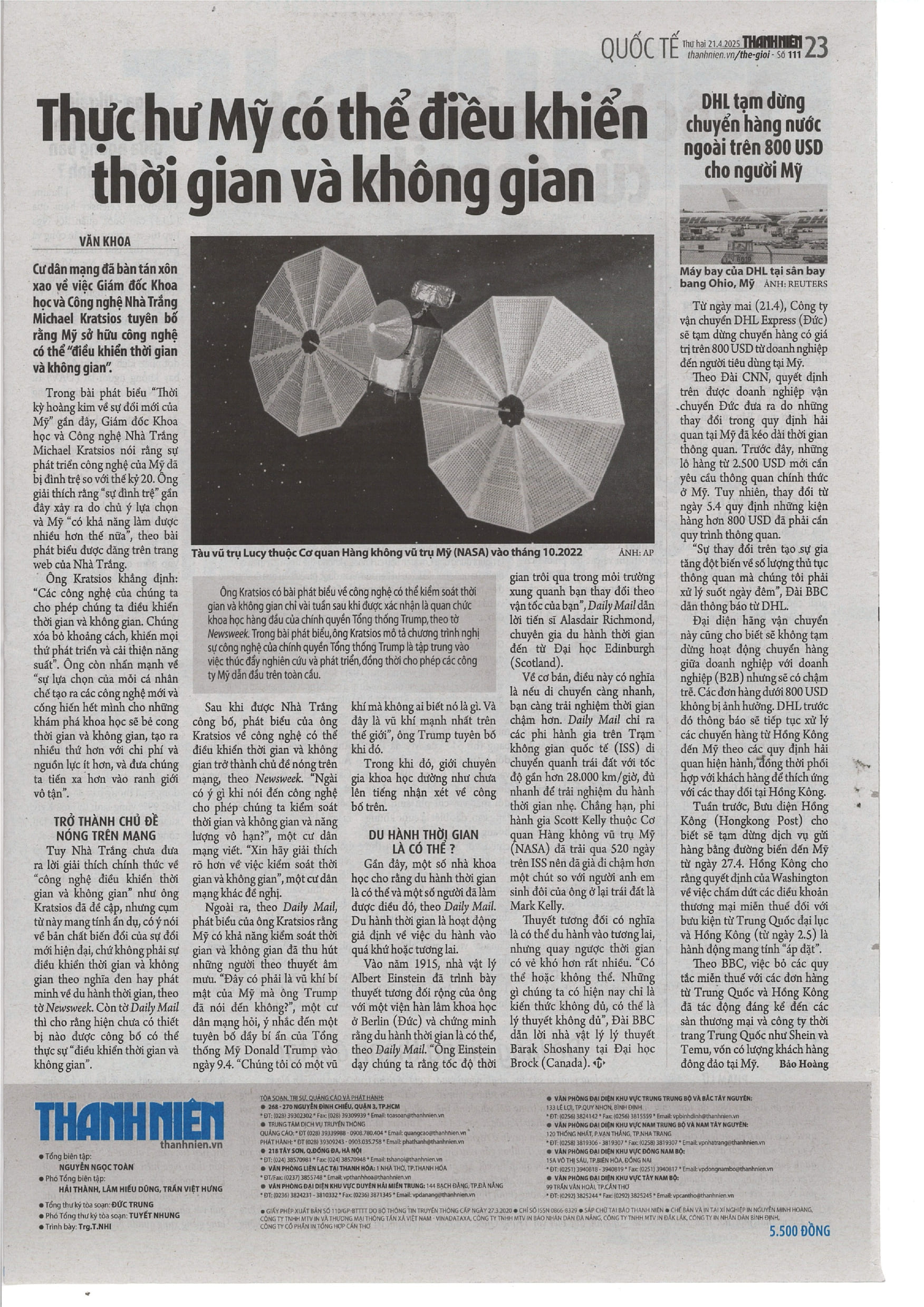 “Sau khi được Nhà Trắng công bố, phát biểu của ông Kratsios về công nghệ có thể điều khiển thời gian và không gian trở thành chủ đề nóng trên mạng, theo Newsweek. “Ngài có ý gì khi nói đến công nghệ cho phép chúng ta kiểm soát thời gian và không gian và năng lượng vô hạn?”, một cư dân mạng viết. “Xin hãy giải thích rõ hơn về việc kiểm soát thời gian và không gian”, một cư dân mạng khác đề nghị.”-trích Báo Thanh Niên