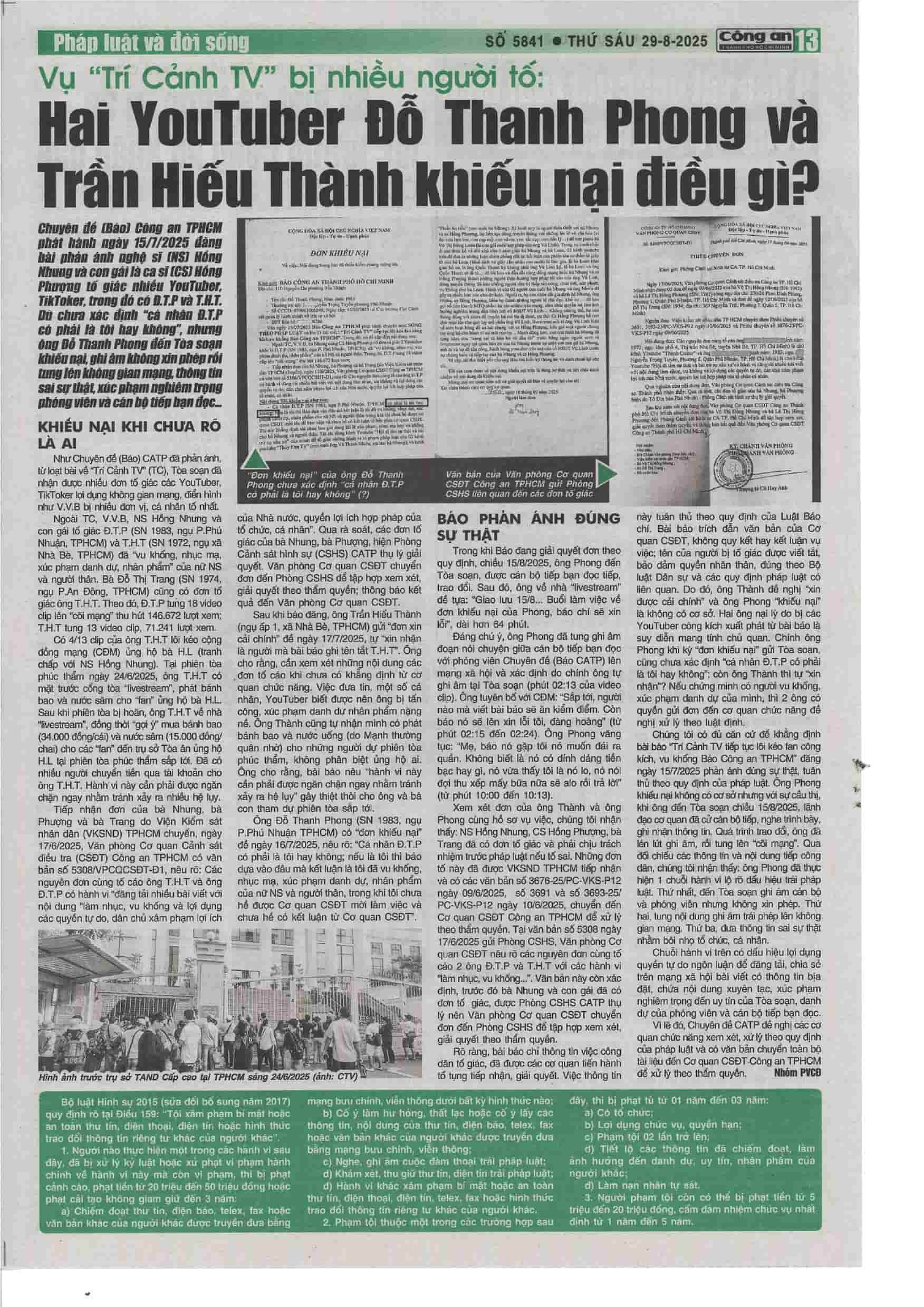 “Như Chuyên đề (Báo) CATP đã phản ánh, từ loạt bài về “Trí Cảnh TV” (TC), Tòa soạn đã nhận được nhiều đơn tố giác các YouTuber, TikToker lợi dụng không gian mạng, điển hình như V.V.B bị nhiều đơn vị, cá nhân tố nhất.